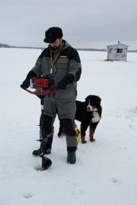 (Photo of Lawrence auguring 10” holes through the ice on the Ottawa River.)