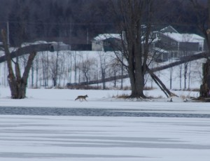 (Photo of a Coyote on the near-frozen Ottawa River.)