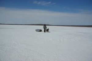In early January 2012 I arranged to hook up with several of my more winter-hardy fishing buddies in Rockland — just a stones throw east of Ottawa. Upon arriving at our meeting spot the river inspired little confidence in our plan to catch Walleye and Sauger through the ice with open water less than 100 feet from shore. Fortunately, our actual destination, a bay just five minutes east, had over 12” of solid ice. Not quite enough to drive out with vehicles, but plenty for a snowmobile and portable shelters. Even still, each of us were carrying hand picks for self-extraction just in case. Anyone who has spent considerable time ice fishing knows there’s no such thing as “safe ice”.