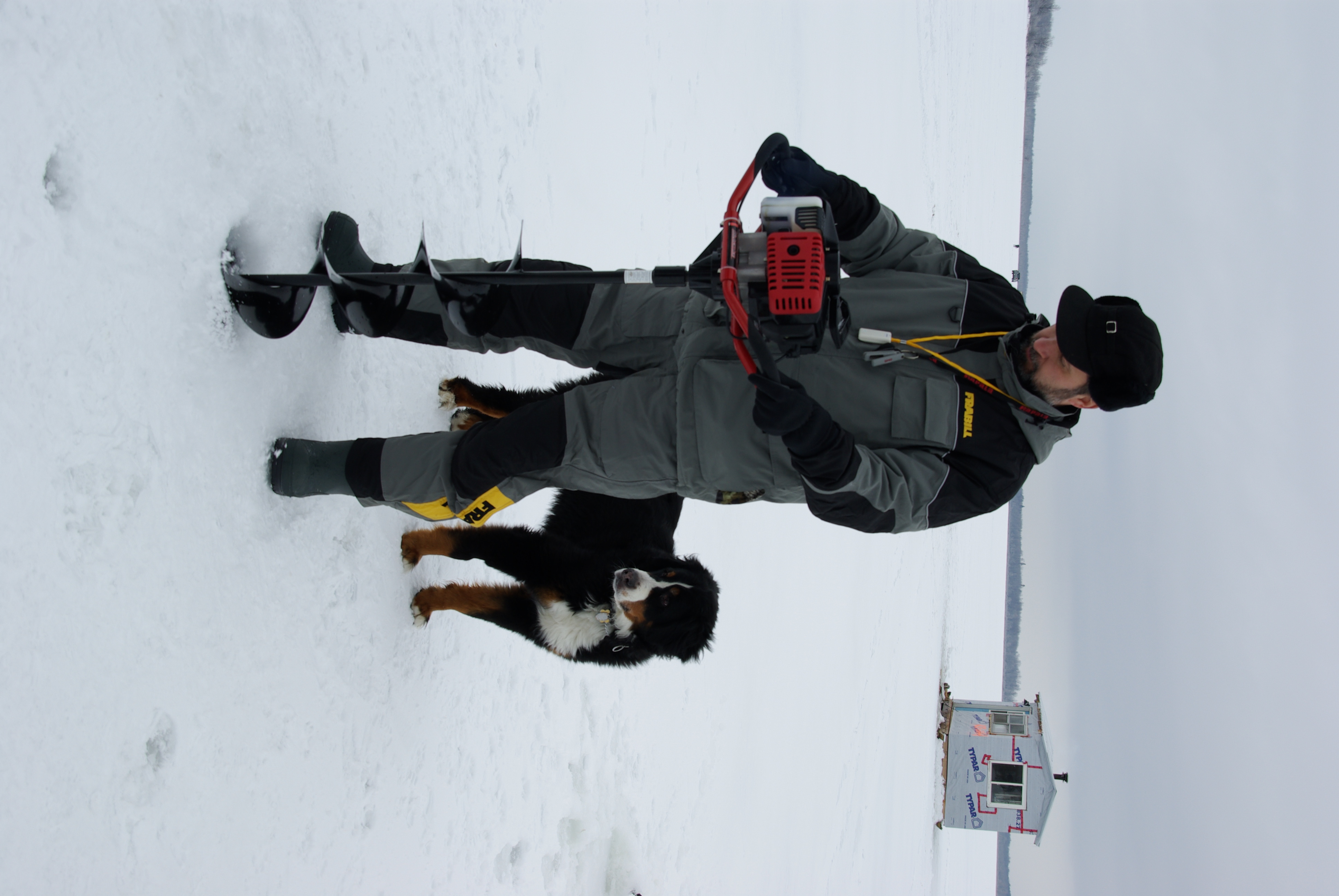 (Photo of Lawrence auguring 10” holes through the ice on the Ottawa River.)