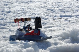 (Photo of Lawrence’s ice fishing dead-stick rig with the audible alarm.)