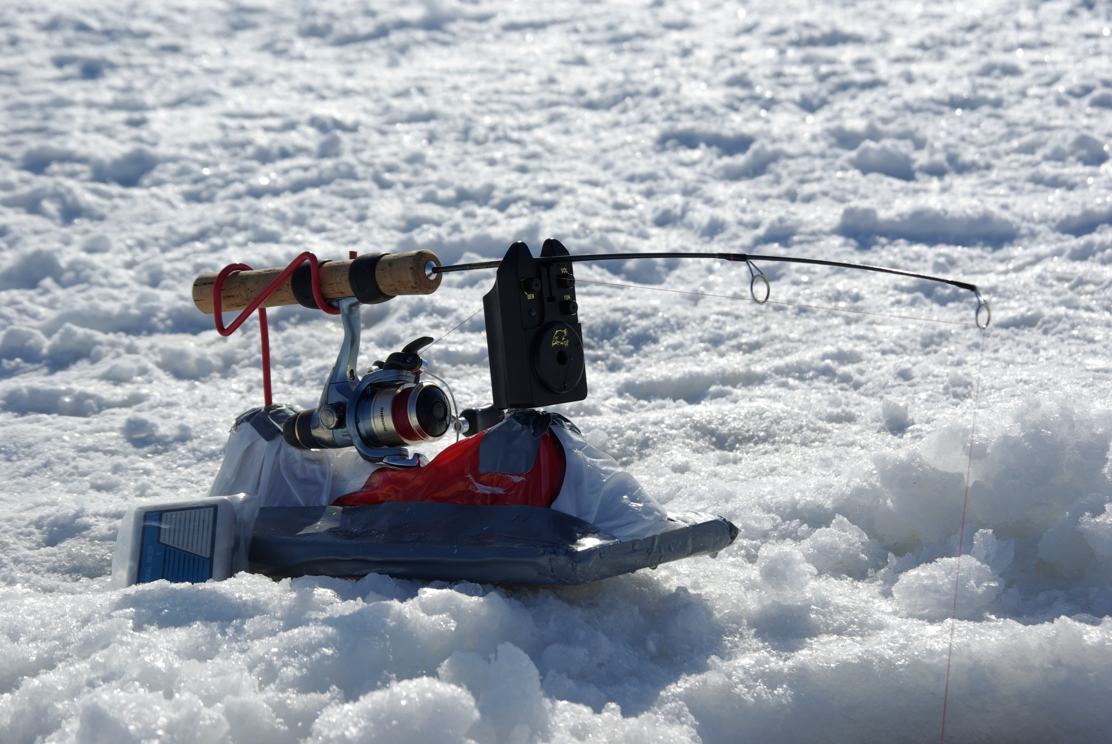 Everyone differs on their preferred method for setting up dead-stick presentations. My own invention employs a wire rod holder, a medium / heavy action ice fishing rod equipped with a Shimano Spirex reel, and an audible bite alarm. (Audible bite alarms are popular among Carp fishers.) I prefer Power Pro Ice braid for jigging and dead-sticking, with a swivel and fluoro leader. The Spirex’s Fight’n drag feature allows me to back off the drag almost completely while the rod rests in the holder, and then quickly reapply drag with a single twist of the wrist when the alarm sounds.