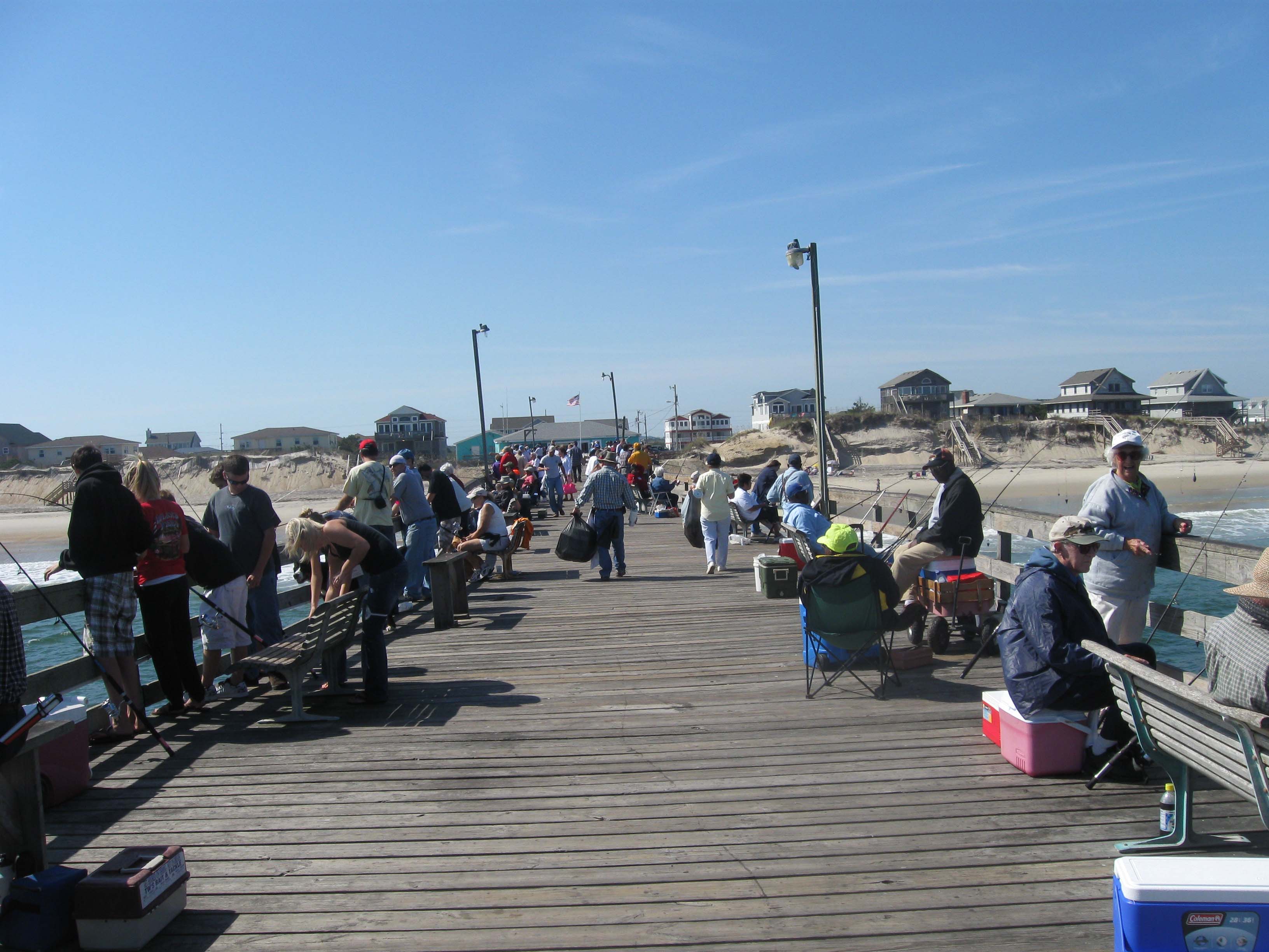 Peers are as long as 1,000 feet (340 meters) and are generally constructed out of wood. Depending upon the tide one can be anywhere from five to 10 feet above the water, with waves rolling under the peer and the occasional wave coming over top on those days following severe weather systems. Occasionally, sections or entire peers are washed away if in the direct path of hurricanes, which are common on the outer banks in North Carolina.