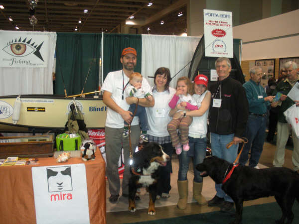 I teamed up with the Mira Foundation and Ontario Portable Boats in a booth size that measured 10’ x 20’. Simon Melrose from Mira participated along with a Mira demonstration dog named Caddy, and Craig Dill, owner of Ontario Portable Boats, was there to handle questions about the Porta-Bote. With Craig and Simon handling questions about the Porta-Bote and Mira Guide Dogs, respectively, I was able to focus my attention on responding to questions specific to fishing and boating with vision loss, and there were many. Thankfully, I was backed up with assistance from my wife’s daughter, Mimi, who was excellent in explaining how the Blind Fishing Boat works.