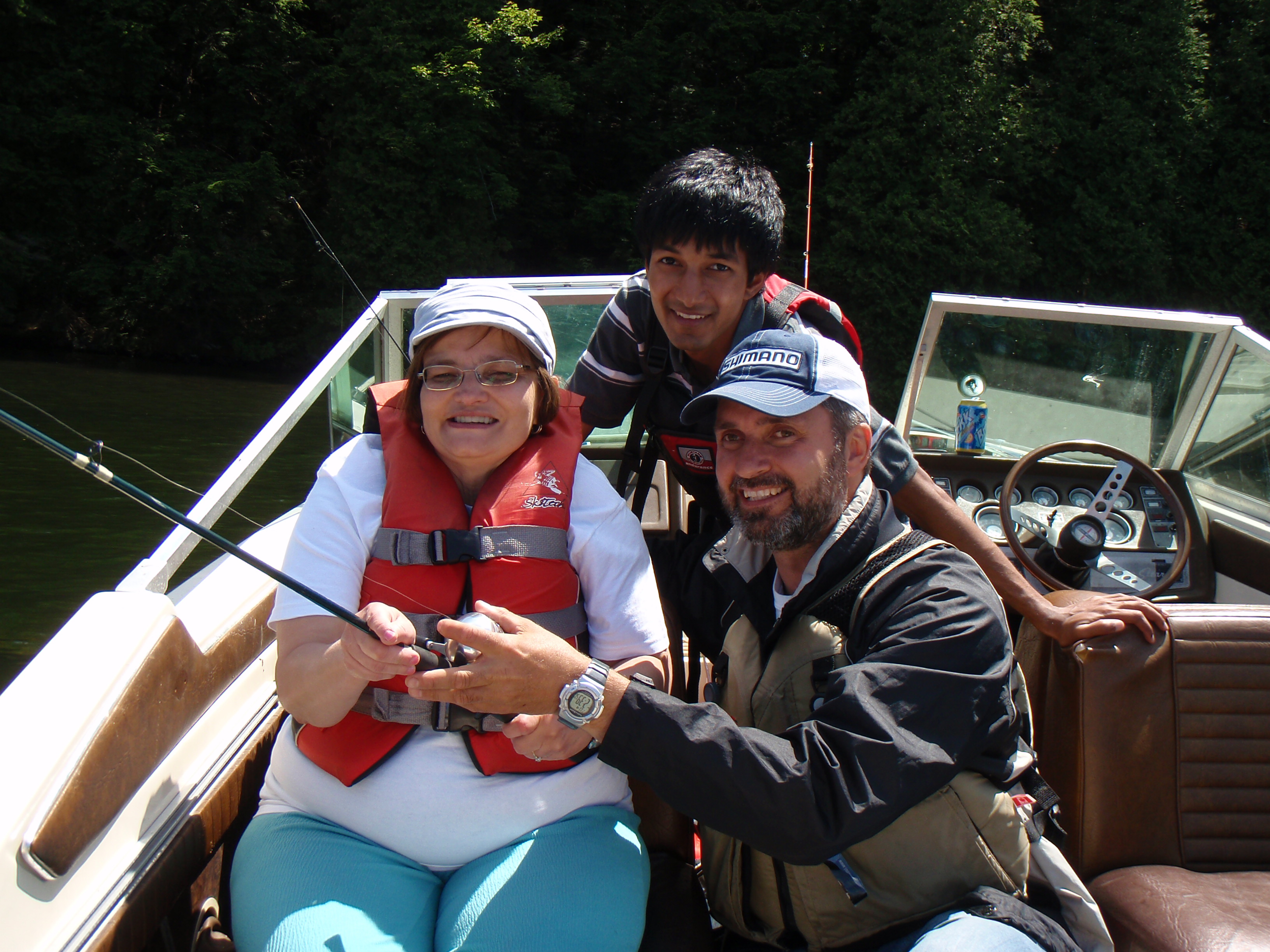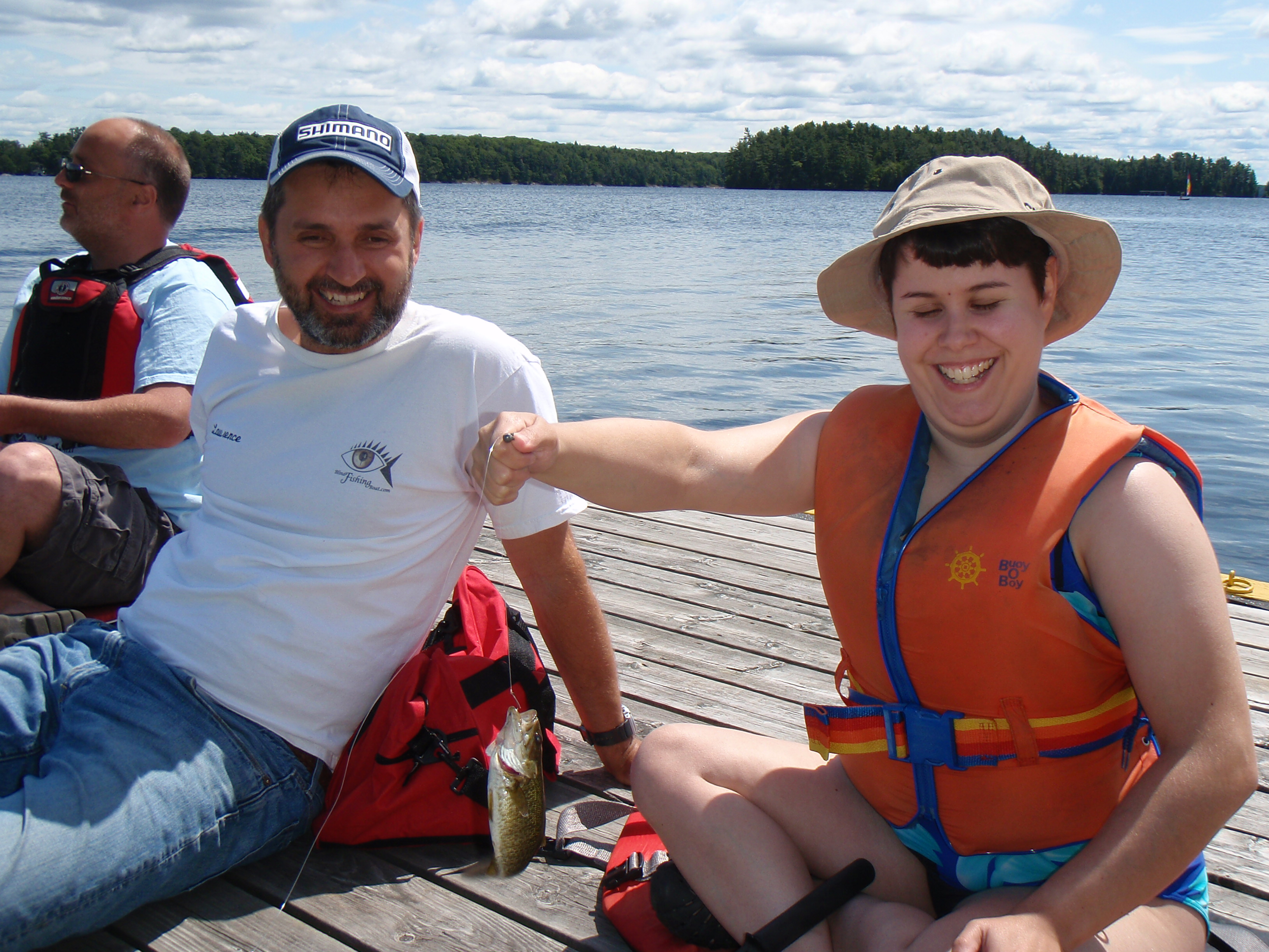 Storms and a significant cold front had air temperatures dropping to between five and ten degrees Celsius each night and strong winds each day. Fishing was more than a little challenging. We were also using two of the CNIB’s boats, (one was a 20-foot fibreglass I/O drive and the other a 30-foot pontoon); however, neither was equipped with a sounder or trolling motor which made tracking down the Small Mouth Bass in Lake Joseph challenging. I knew they would be down about 20 to 30 feet, suspending off humps and transition points, but finding these structures and then maintaining position over them was near impossible. For some of the more boat-shy participants, doc fishing was the name of the game.