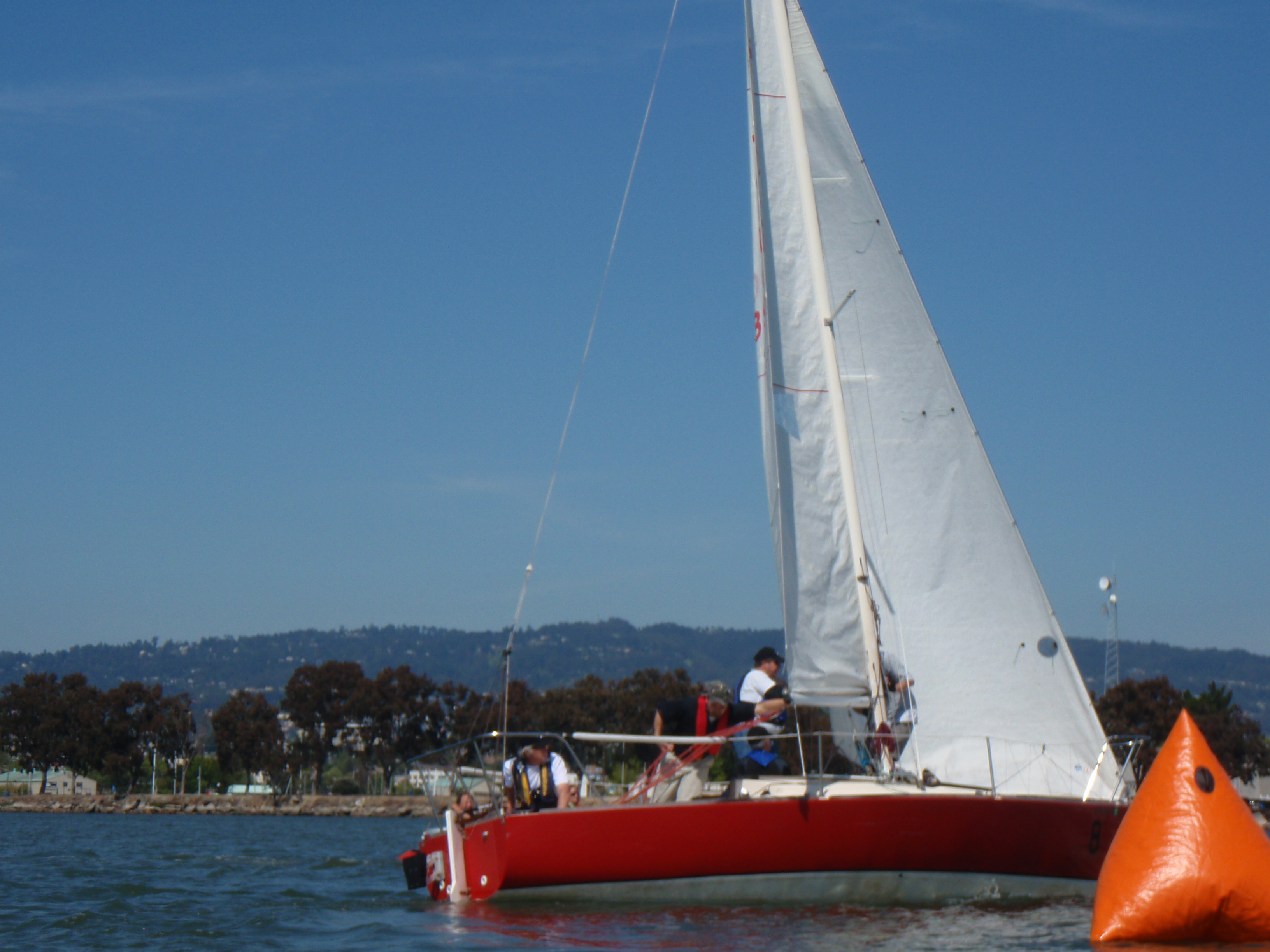 Both our helmsman and I are 6’3″ and weigh just over 200lbs each. We figured weight distribution was critical so on day two I began slipping forward parallel to the mass placing my weight on one side of the boat or the other after each adjustment to the mail sail. Movement of the sails, tiller and all persons aboard was always done smoothly and in well-timed increments to avoid rocking the boat and taking off speed. All this must have helped as on day two we did much better.